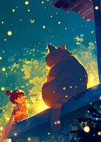 Op een rustige avond zitten een kat en een meisje samen op een schuin dak, hun silhouetten afgetekend tegen de warme tinten van de ondergaande zon. Het meisje, met haar haren zachtjes wapperend in de wind, staart peinzend naar de horizon terwijl de kat, een pluizige tabby, tevreden naast haar ligt, haar staart lui zwiepend. De lucht is gevuld met een gevoel van vrede terwijl ze genieten van het stille moment en een band delen die woorden te boven gaat. De geluiden van de stad in de verte vermengen zich met het zachte spinnen van de kat, wat een serene achtergrond creëert voor hun kameraadschap.