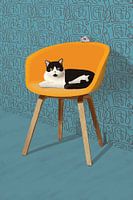 Je ziet een kat in een stoel voor een wild behangpatroon. De kat merkt de muis op de rugleuning van de stoel niet op.
