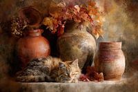 Warm en rustiek herfststilleven met aardewerken vazen, herfstbladeren en een ontspannen kat. Sfeervol en huiselijk voor elk interieur.