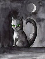 Deze betoverende aquarelillustratie vangt een mysterieus moment onder de nachtelijke hemel. Centraal in het beeld zit een kat met opvallende groene ogen, haar lichaam gevormd in expressieve tinten zwart, grijs en wit. De sierlijk gekrulde staart en de intense blik geven het dier een bijna magische uitstraling. Achter haar ontvouwt zich…