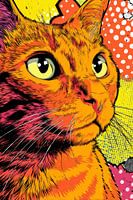 Deze vurige popart-illustratie toont een kat met een intense, gefocuste blik en een vacht die overloopt in levendige oranje, rode en gele tinten. De achtergrond is gevuld met speelse grafische patronen in wit, geel en blauw die doen denken aan stripkunst, wat de expressiviteit van het werk versterkt. De combinatie van scherpe lijnen, heldere kleuren en een nieuwsgierige uitstraling maakt dit kunstwerk een perfecte eyecatcher voor moderne interieurs met een liefde voor katten en popcultuur.