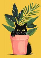 Een illustratie van een kleine zwarte kat die door de bladeren van een bloempot gluurt.