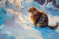 Een majestueuze kat troont in een magisch winterlandschap, haar vacht glinstert warm en levendig in het zachte licht. Omringd door ongerepte sneeuw en fijne grassen straalt ze een kalme gratie uit. Haar waakzame ogen lijken de geheimen van de winterse stilte vast te leggen, terwijl de ijzige sfeer het moment omhult met een dromerige elegantie.