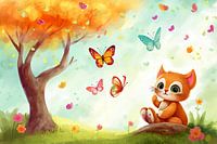 Dit kunstwerk voor in de babykamer toont een schattige kat omringd door kleurrijke vlinders. De kat kijkt vrolijk en nieuwsgierig om zich heen, terwijl de vlinders rustig om haar heen fladderen. De boom is weelderig en vol leven, met oranje bladeren en bloeiende bloemen die de lucht vullen met hun zoete geur. Het geheel heeft een zachte…