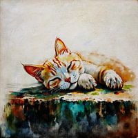 De penseelstreken volgen subtiel de zachtheid van de kattenvacht en nodigen de kijker uit om het vredige ritme van de sluimer te voelen. De gekrulde vorm van de kat rust op een steen die ruw en solide is geschilderd, als een stabiele, betrouwbare basis. De warme tinten van de kattenvacht en de koele neutraliteit van de achtergrond creëren een opvallende visuele balans, waardoor het onderwerp kan ademen en toch de blik van de kijker kan afdwingen.