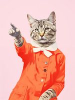 Dit motief toont een kat in een oranje vintage jurk. De achtergrond is roze.