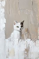 Uit de ruige textuur van verfvlakken komt een kat tevoorschijn, half versmolten met haar omgeving. De brede streken van wit, beige en grijs bouwen een abstract landschap, waaruit de gestalte van de kat zich losmaakt. Toch blijft zij verbonden met de achtergrond – alsof ze evenzeer een deel is van de verf als van de wereld die ze observeert.