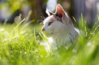 Een kat liggend in het hoge gras die heerlijk aan het genieten is van het zonnetje.