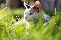 Een kat die - liggend in het hoge gras - heerlijk aan het genieten is van het zonnetje.