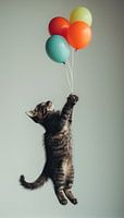 Deze kat met ballonnen (Hang in there) staand panorama schilderij is een speels en hartverwarmend kunstwerk dat positiviteit en doorzettingsvermogen op een luchtige manier uitbeeldt. In dit staande panorama zien we een schattige kat die zich met beide pootjes vasthoudt aan een bos kleurrijke ballonnen, zwevend in de lucht. De titel "Hang in there" geeft dit vrolijke tafereel een extra betekenisvolle lading – een subtiele aanmoediging om vol te houden, wat er ook gebeurt.