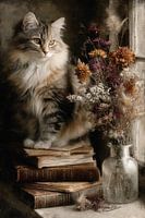 Een sfeervol schilderij van een kat zittend op oude boeken naast een vaas met bloemen straalt warmte en verfijning uit. Een tijdloos tafereel dat een gevoel van nostalgie en verstilde elegantie oproept.
