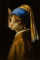 Deze charmante kat, gehuld in de stijl van Vermeers "Meisje met de parel", straalt een speelse maar toch verfijnde schoonheid uit. De warme kleuren en subtiele lichtval geven het geheel een tijdloze, artistieke uitstraling.