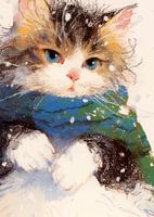 Een pluizige kitten met opvallende blauwe ogen is gewikkeld in een blauwe en groene sjaal. De vacht van het kitten is een mix van zwart en bruin met een vleugje wit, waardoor het er prachtig gestructureerd uitziet. Zachte sneeuwvlokken vallen zachtjes om het kitten heen en suggereren een serene winterse omgeving. De uitdrukking van de…