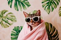 Een coole kat, gewikkeld in een zachte, roze handdoek, slaat een ontspannen figuur in de stijlvolle zonnebril voor een tropisch bladontwerp. Deze charmante afbeelding geeft een frisse, humoristische toets aan elke woon- of slaapkamer en tovert zeker een glimlach op het gezicht van iedereen die hem ziet. Perfect voor kattenliefhebbers en trendsetters!