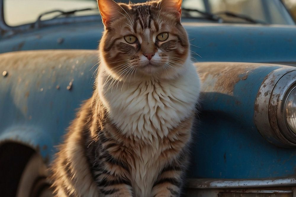 Kat zittend op de bumper van een blauwe roestige Amerikaanse oldtimer bij warm avondlicht. Het geheel geeft een romantisch sfeerbeeld.