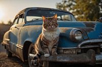 Kat zittend op de bumper van een blauwe roestige Amerikaanse oldtimer bij warm avondlicht. Het geheel geeft een romantisch sfeerbeeld.