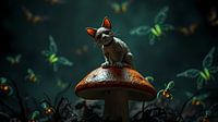Een eigenwijze kat zit op een paddenstoel in een onwerkelijke, sprookjesachtige omgeving.