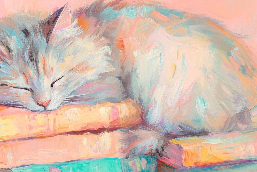 Gewiegd door zachte pasteltinten is een fluwelen kat in een dromerige houding op een kleurrijke stapel boeken betoverend. De zachte, onscherpe kleuren harmoniëren met het vredige karakter van het slaperige schepsel en nodigen je uit om je onder te dompelen in de wereld van verhalen. Een magisch moment tussen kennis en rust.