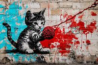 Dit opvallende ontwerp toont een schattige kat die speels een rode bol wol vasthoudt, tegen een achtergrond van levendige kleuren en street art-stijl. Het is een perfecte combinatie van speelse energie en creatieve kunst, waardoor het ideaal is voor elke moderne ruimte. Of het nu in een woonkamer, kantoor of slaapkamer wordt geplaatst, het brengt gegarandeerd een vleugje dynamiek en charme in de ruimte. Met zijn contrasterende kleuren en unieke ontwerp trekt het direct de aandacht en voegt het een artistieke flair toe aan elke omgeving. Dit stuk is perfect voor dierenliefhebbers en kunstenthousiastelingen die op zoek zijn naar iets unieks.