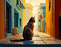 Een driekleurige kat zit in een dorpsstraat met zeer kleurrijke gevels. De vredige uitstraling van de kleine katachtige's laat zien dat hij zich vol vertrouwen in een vertrouwde omgeving heeft gevestigd. De compositie grenst aan het abstracte met zijn grafische vormen en kleuren. Contrast tussen het schaduwrijke deel waar de kat zich bevindt en het verder weg gelegen deel van de steeg, dat in de volle zon ligt.