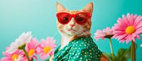 Een charmant katje met een stijlvolle rode zonnebril en een kleurrijke outfit, omringd door fleurige bloemen, straalt pure levensvreugde uit. Dit vrolijke tafereel brengt een zomers en luchtig gevoel in huis en is perfect voor de woonkamer of keuken, waar het ieders aandacht zal trekken.