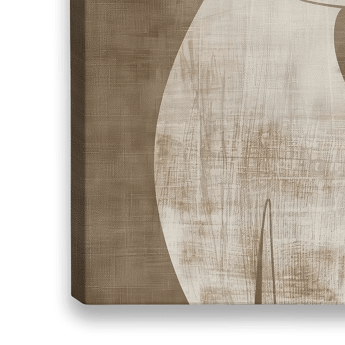 Kat | Serene Whiskers - Dit kattenschilderij toont een stilistische en serene weergave van een kat. De kat is prominent aanwezig met een vereenvoudigde, bijna abstracte vormgeving. Het grootse silhouet vult het canvas van boven tot aan de onderrand, met de focus op de zachte ronding van de rug en de punt van de oren die omhoog steken.…