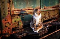 Portret van een kat op de treeplank van een oud rijtuig in het Belgische Hombourg.