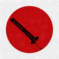 Abstract gouache schilderij van deel van een katana tegen de rode Japanse vlag