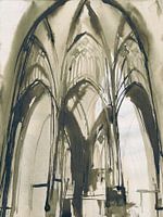 Kunst van aquarel en bamboe-pen op aquarelpapier van het schip van een kathedraal.