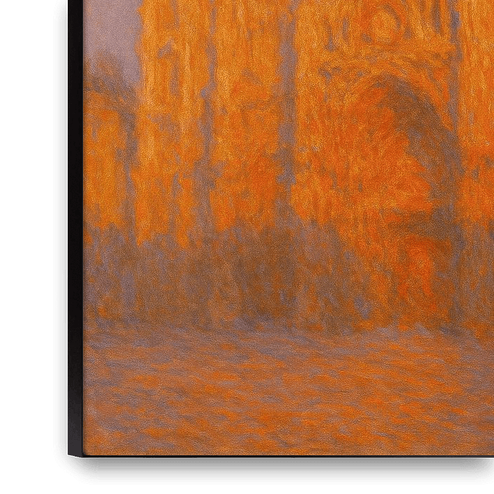 Dit opvallende kunstwerk toont de voorgevel van de kathedraal van Rouen verlicht door een adembenemende zonsondergang, geschilderd in een levendige Monet-geïnspireerde stijl die het licht in zijn meest dramatische vorm viert. De kathedraal lijkt bijna in vuur en vlam te staan in gesmolten oranje en stralend goud, prachtig gecontrasteerd…
