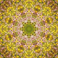 De rhododendron is de nationale bloem van Nepal. Dit kleurrijke kaleidocopische, op een achthoek gebaseerde werk is gemaakt door het kopiëren, roteren en mengen van een foto van gele en rose rhododendrons op een zonnige voorjaarsdag.