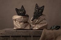 Twee schattige katjes / kittens in papieren zakken, een ouderwetse portemonnee en guldens op een houten krat. Een stilleven, gebaseerd op het spreekwoord "de kat in de zak kopen"