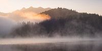 Mist ligt in de bergen van de Karwendel en op het Geroldmeer op een ochtend in de zomer