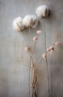 Stijlvol minimalistisch stilleven van katoenbloemen. Ingetogen kleuren en een subtiele compositie van natuurlijke elementen vormen een serene verbeelding van vergankelijkheid.