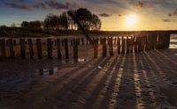 Op het strandje bij het Katse Veer staan verschillende groepen palen, waaronder deze. Dankzij eb stonden ze droog. Zo lage zon maakt er een mooi patroon van.