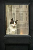 Een huiskat zittende achter een raam in de Jordaan in Amsterdam.