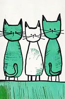 Katten | Trio of Whiskers - Dit dieren schilderij illustreert drie gestileerde katten in simplistische lijnen, twee zijn levendig groen en één is wit, tegen een witte achtergrond met een prominente groene strook die de ondergrens vormt.