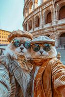 Ontdek "Stylish World Travellers", een prachtig portret van twee elegante katten die opvallen door hun modieuze uitstraling. Dit beeld legt het duo in perfecte harmonie vast tegen een historische achtergrond, aangevuld met hun trendy tweed outfits en bijpassende zonnebrillen. De compositie speelt met het idee dat onze dierenvrienden ook klaar zijn voor avontuur. Elk detail, van de reflecterende glazen tot de fijn afgestemde accessoires, voegt een uitnodigende warmte en een vleugje humor toe aan dit kunstwerk. Een must-have voor elke kattenliefhebber en fan van dierlijke elegantie die zowel het hart als het huis zal opvrolijken.