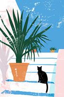 De foto toont een zonnig tafereel met een weelderige palmboom in een terracottakleurige pot die levendige groene bladeren verspreidt. Een zwarte kat zit rustig op het lichtblauwe trapje en geeft de compositie een charmant tintje. De heldere lucht en zachte kleuren geven een gevoel van rust en mediterrane idylle.