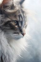 De foto toont het aangezicht van een langharige kat, waarbij de ogen het middelpunt vormen. De ogen stralen een intense alertheid uit, als twee amberkleurige vlammen die dansen in het licht. Ze lijken een diepe connectie met de natuur te belichamen, als vensters naar een wereld van instinct en intuïtie. De fijne haren rond de ogen vormen een zachte omlijsting, als een schilderij waarin de blik van de kat centraal staat. Deze foto ademt een gevoel van oerkracht en elegantie, als een herinnering aan de wilde ziel die in elke kat schuilt.