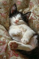 Een zwart-witte kat ligt heerlijk in diepe rust, omringd door zachte dekens met een romantisch bloemenpatroon. De ontspannen houding en het tevreden snoetje ademen pure rust en geborgenheid. Dit schilderij vangt het mooiste van een vredig kattenmoment – een klein stukje huiselijke warmte dat nooit verveelt. Perfect voor iedereen die…