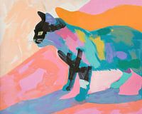 Kattenschilderij | Pastel Prowler - Dit kattenschilderij toont een gestileerde zwarte kat tegen een achtergrond van levendige pasteltinten die op abstracte wijze in elkaar overlopen.