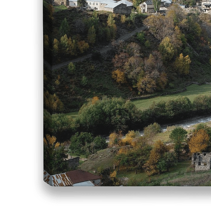 Een overzichtsfoto van een klein dorpje in de Kaukasus te Georgie.