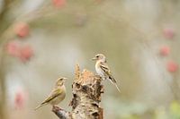 Een keep en een groenling kijken elkaar afwachtend aan. Op de achtergrond rozenbottels. Het lijkt alsof ze omringd worden door een rozenboog.