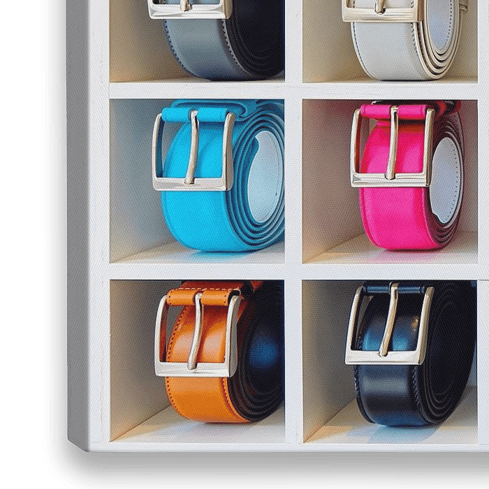 Abstracte fotografie van een witte vitrinekast met kleine vierkante vakjes gevuld met een verscheidenheid aan kleurrijke leren riemen. Het ontwerp is minimalistisch, met een focus op eenvoud en duidelijkheid om de individuele stukken te benadrukken.