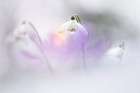 Sneeuwklokjes met een bloeiende krokus in de voorgrond.