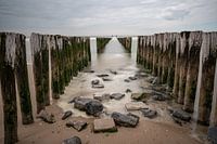 Keien in het begin van een golfbreker op het strand bij Zoutelande (provincie Zeeland in Nederland).