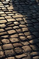 Kasseien van een oude straat in de oude stad Magdeburg in Duitsland in warm tegenlicht en ondergaande zon op de avond van een zomerdag