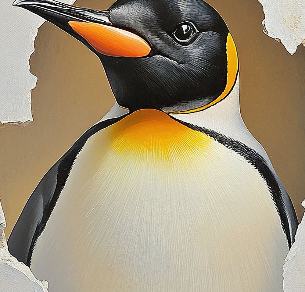 Keizerpinguïn | Shattered Serenity - Dit dierenschilderij toont een keizerpinguïn die door een gescheurde witte muur kijkt, met een sterke focus op de levendige zwart, witte en gele kleuren van zijn verenkleed.