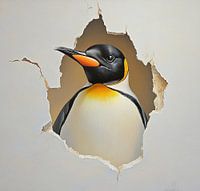 Keizerpinguïn | Shattered Serenity - Dit dierenschilderij toont een keizerpinguïn die door een gescheurde witte muur kijkt, met een sterke focus op de levendige zwart, witte en gele kleuren van zijn verenkleed.
